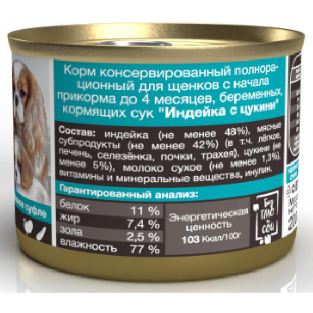 Состав: индейка (не менее 48%), мясные субпродукты (не менее 42%) (лёгкое, печень, селезёнка, печень, почки, трахея), кабачок (не менее 5%), молоко сухое (не менее 1,3%), витамины и минеральные вещества.