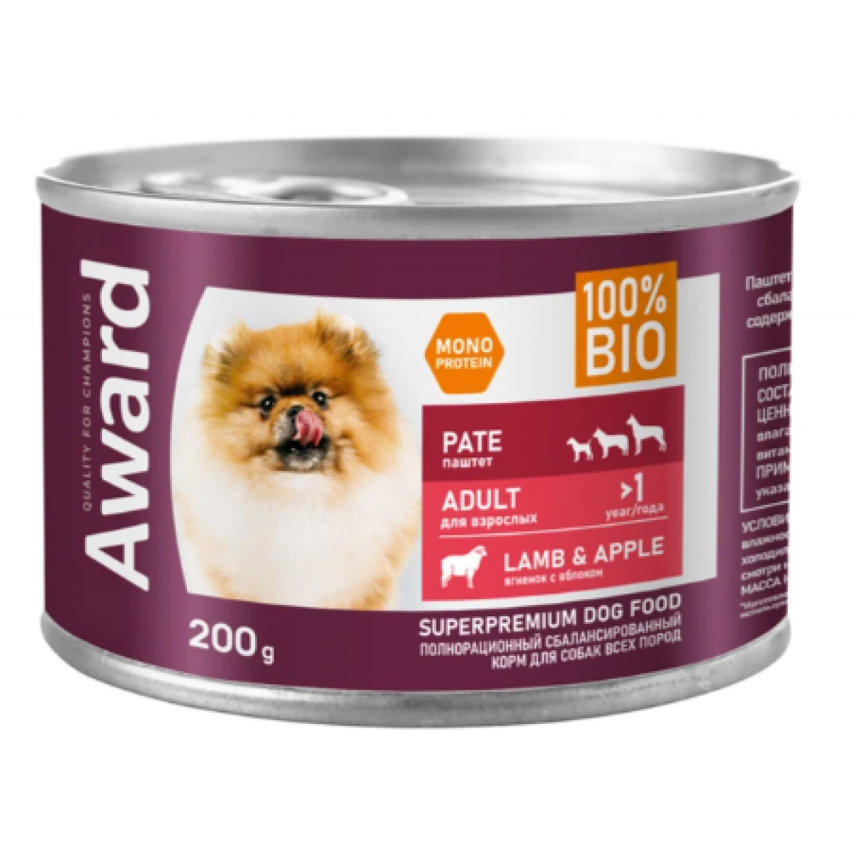 Влажный корм AWARD для взрослых собак паштет из ягненка с яблоком