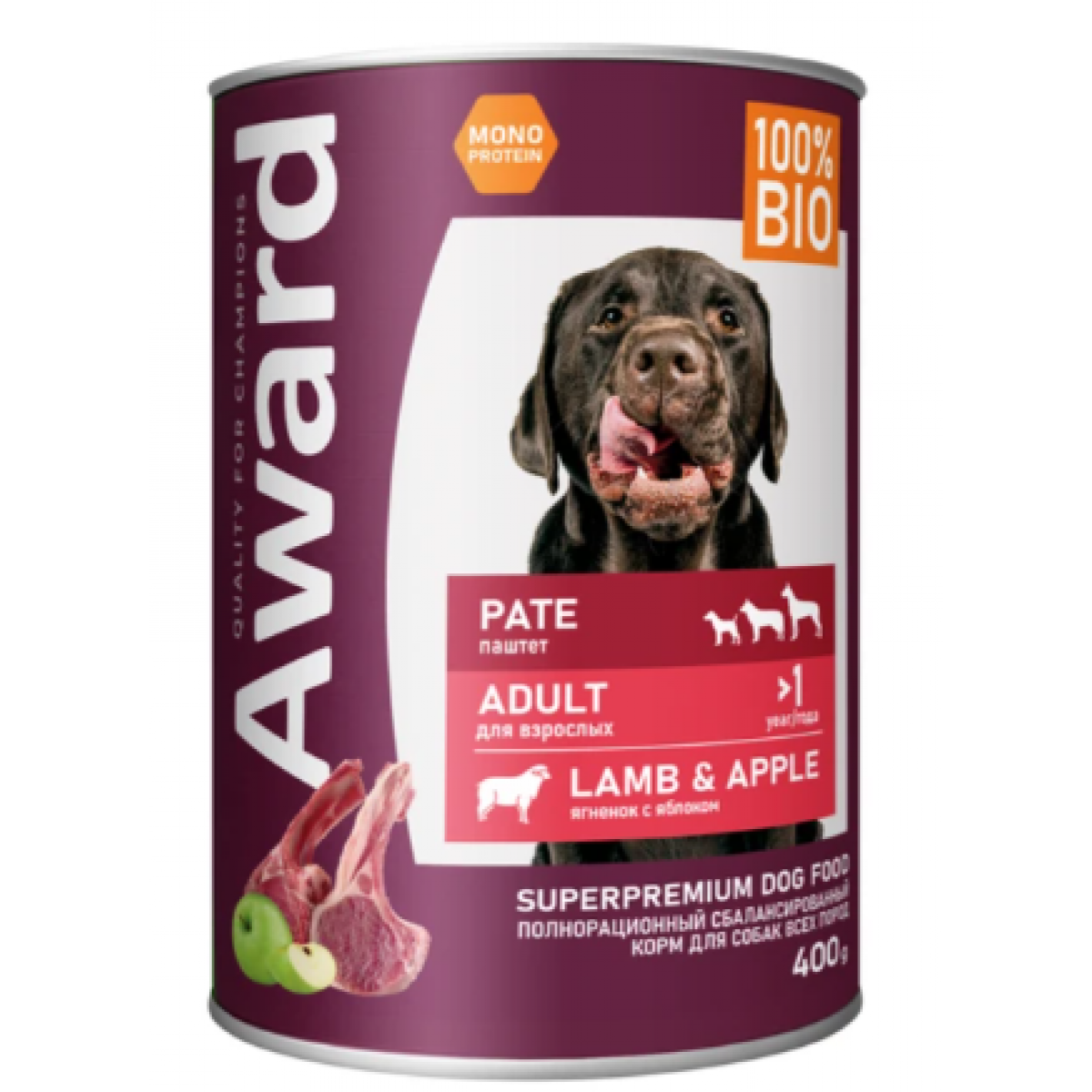 Влажный корм AWARD для взрослых собак паштет из ягненка с яблоком
