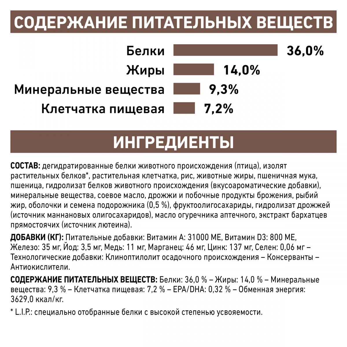 СОДЕРЖАНИЕ ПИТАТЕЛЬНЫХ ВЕЩЕСТВ: Белки: 36,0 % - Жиры: 14,0 % - Минеральные вещества: 9,3 % - Клетчатка пищевая: 7,2 % - EPA/DHA: 0,32 % - Обменная энергия: 3629,0 ккал/кг.