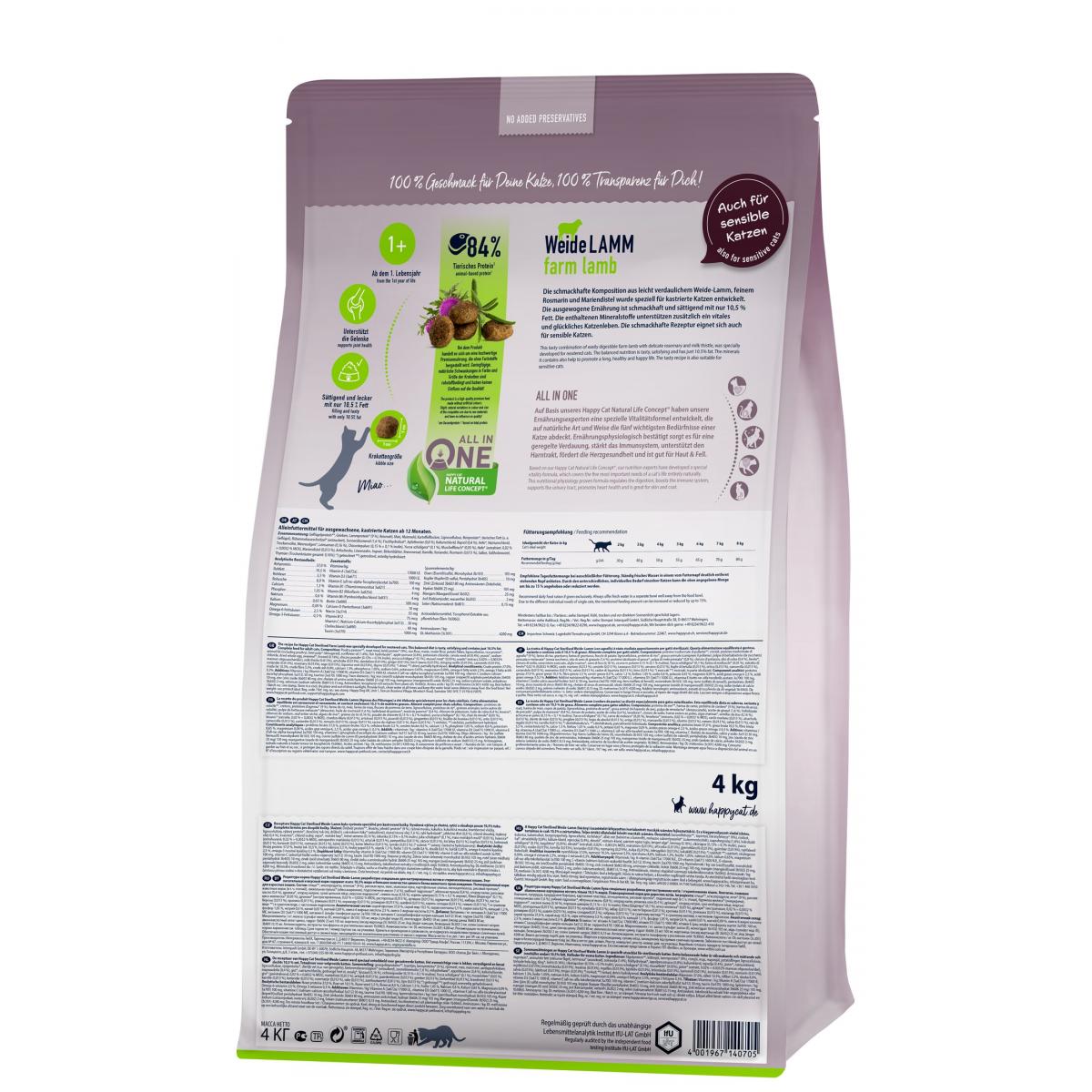 Happy Cat Sterilised WeideLamm (Ягненок) - это корм, специально разработанный для кастрированных котов и стерилизованных кошек. Этот сытный и вкусный корм, богатый балластными веществами, содержит всего 10,5% жира и большое количество ценного белка животного происхождения из легко усваиваемого мяса ягненка и вкусного мяса птицы.