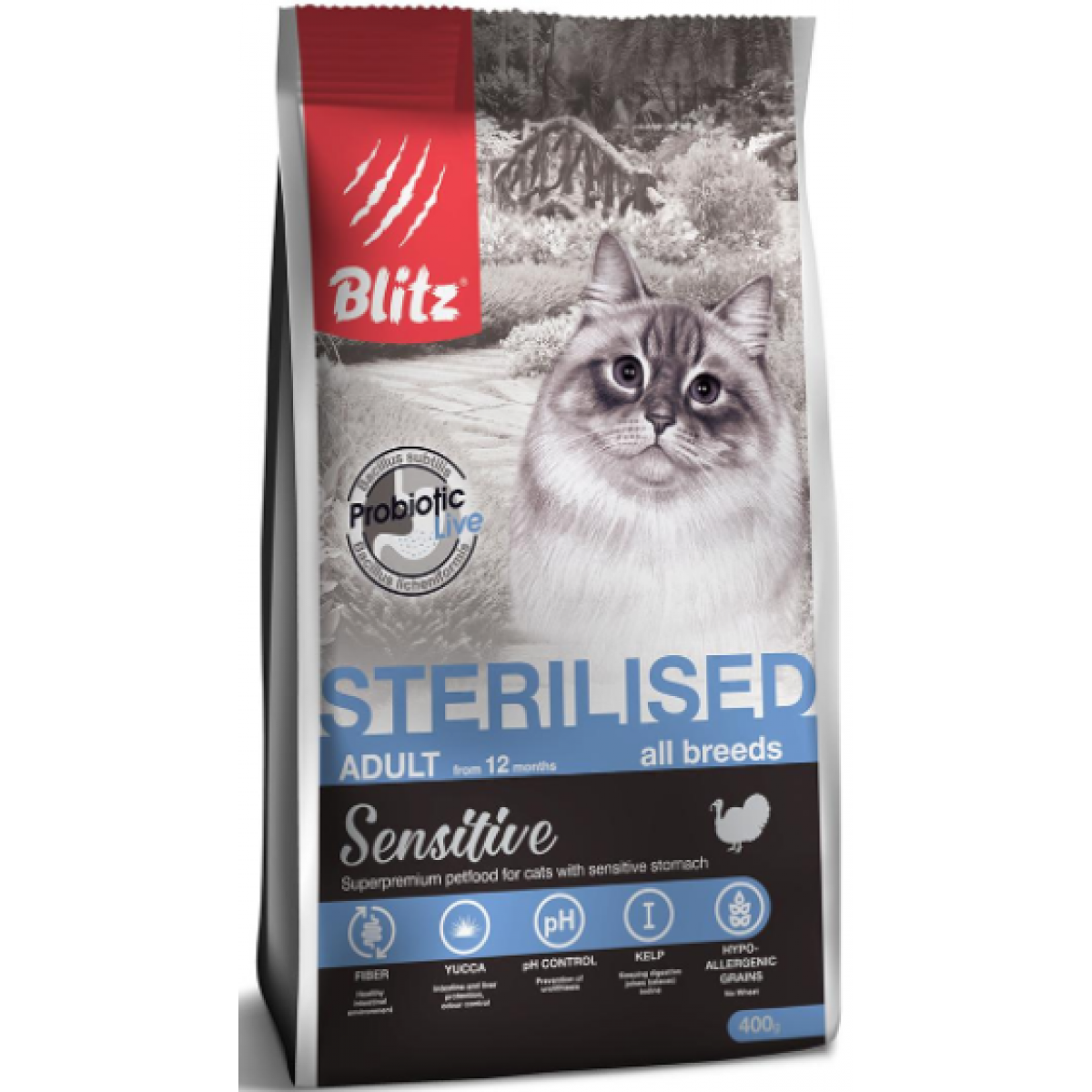 BLITZ Sensitive Adult Sterilised Cats (Индейка) - это полнорационный сухой корм суперпремиум класса на основе мяса индейки для стерилизованных кошек и кастрированных котов имеет оптимальный баланс питательных веществ и сбалансированный уровень минералов.