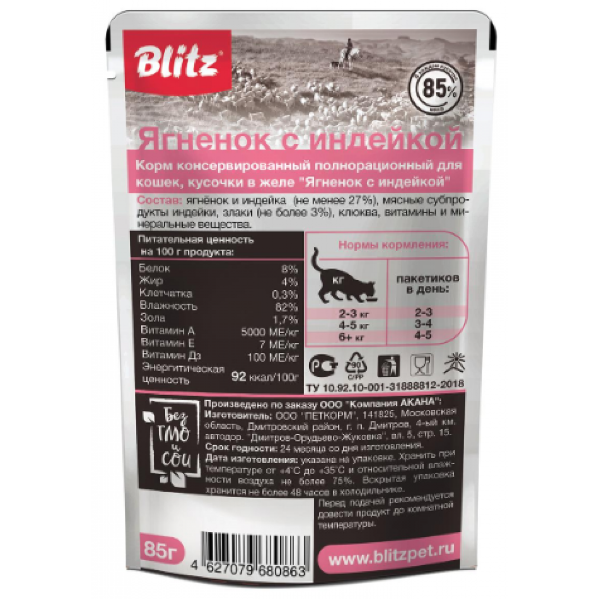 BLITZ Sensitive Ягненок с индейкой - полнорационный влажный корм для взрослых кошек идеально подойдёт для питомцев с чувствительным пищеварением, благодаря своей высокой усвояемости и низкоаллергенным источникам белка.