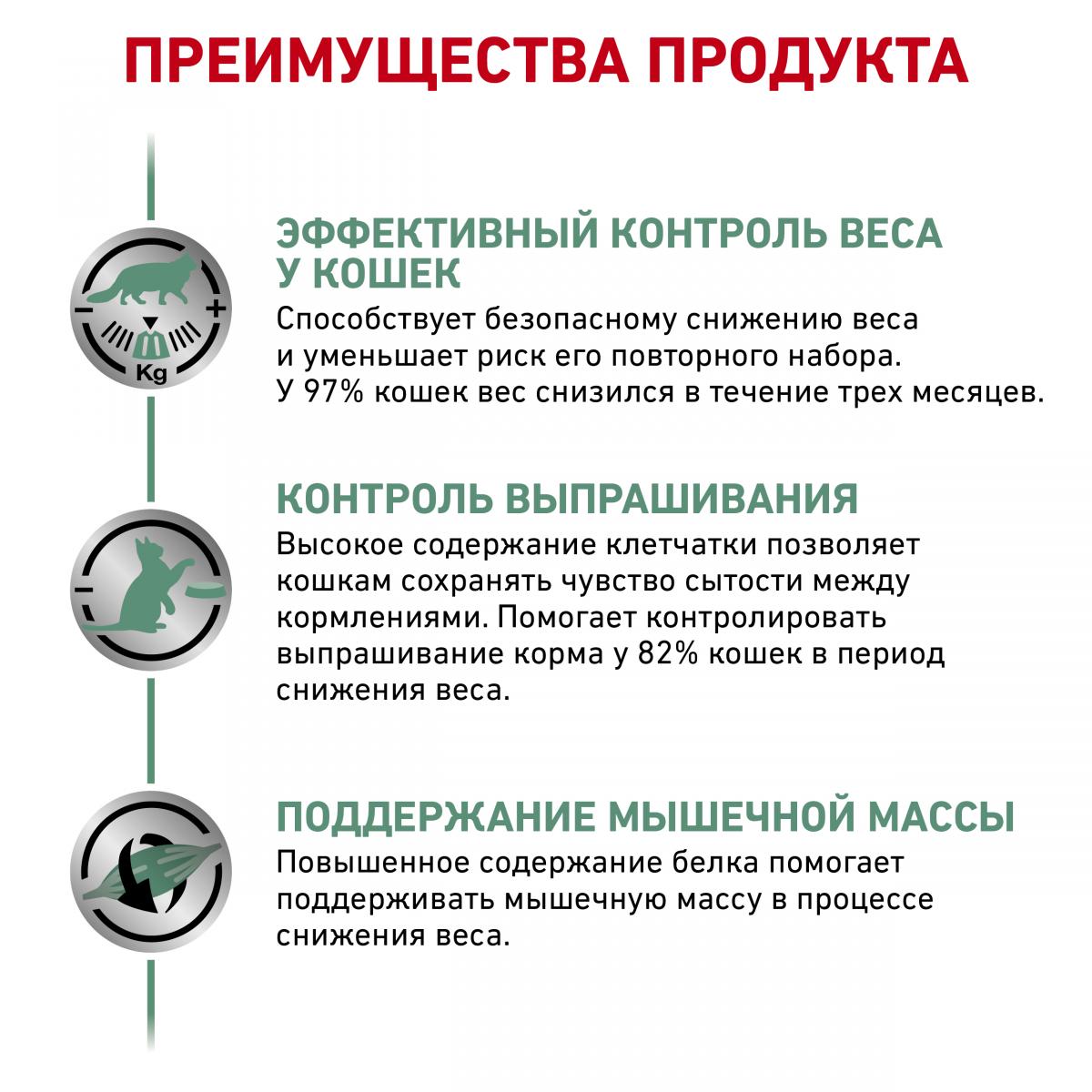 1) Эффективный контроль массы тела: Способствует безопасному снижению веса и уменьшает риск его повторного набора. У 97%* кошек вес снизился в течение трех месяцев. *Флэнаган Дж., Биссо Т., Ауэрс М.-Э., Морено Б., Джерман А.Дж. «Международное многоцентровое когортное исследование снижения веса у кошек с избыточным весом: различия в результатах, полученных в разных географических регионах».2) Контроль выпрашивания: Высокое содержание клетчатки позволяет кошкам сохранять чувство сытости между кормлениями. Помогает контролировать выпрашивание корма у 82%** кошек в период снижения веса. **Биссо Т., Серве Э., Видаль С., Дебуаз М., Сергерер Р., Эгрон Э., Юггонар М., Хит С.Э., Бьюрж В., Джерман А.Дж. «Новые стратегии питания способны улучшить результаты программ по снижению веса у кошек, страдающих ожирением».3) Поддержание мышечной массы: Повышенное содержание белка помогает поддерживать мышечную массу в процессе снижения веса.