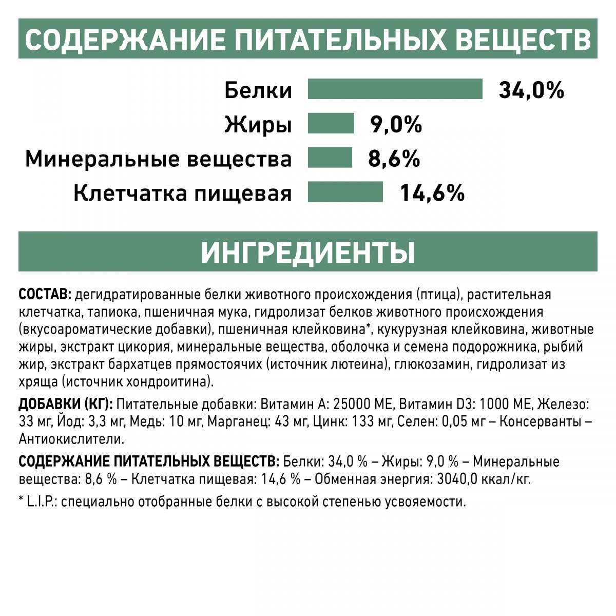 ИНГРЕДИЕНТЫ: дегидратированные белки животного происхождения (птица), растительная клетчатка, тапиока, пшеничная мука, гидролизат белков животного происхождения (вкусоароматические добавки), пшеничная клейковина*, кукурузная клейковина, животные жиры, экстракт цикория, минеральные вещества, оболочка и семена подорожника, рыбий жир, экстракт бархатцев прямостоячих (источник лютеина), глюкозамин, гидролизат из хряща (источник хондроитина).