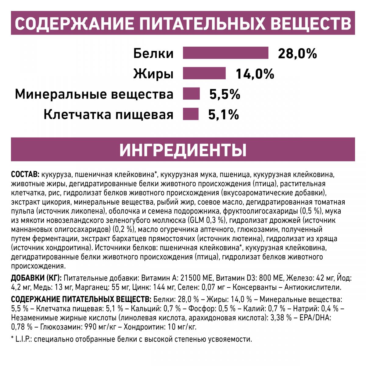ИНГРЕДИЕНТЫ: кукуруза, пшеничная клейковина*, кукурузная мука, пшеница, кукурузная клейковина, животные жиры, дегидратированные белки животного происхождения (птица), растительная клетчатка, рис, гидролизат белков животного происхождения (вкусоароматические добавки), экстракт цикория, минеральные вещества, рыбий жир, соевое масло, дегидратированная томатная пульпа (источник ликопена), оболочка и семена подорожника, фруктоолигосахариды (0,5 %), мука из мякоти новозеландского зеленогубого моллюска (GLM 0,3 %), гидролизат дрожжей (источник мaннановых олигосахаридов) (0,2 %), масло огуречника аптечного, глюкозамин, полученный путем ферментации, экстракт бархатцев прямостоячих (источник лютеина), гидролизат из хряща (источник хондроитина). Источники белков: пшеничная клейковина*, кукурузная клейковина, дегидратированные белки животного происхождения (птица), гидролизат белков животного происхождения.
