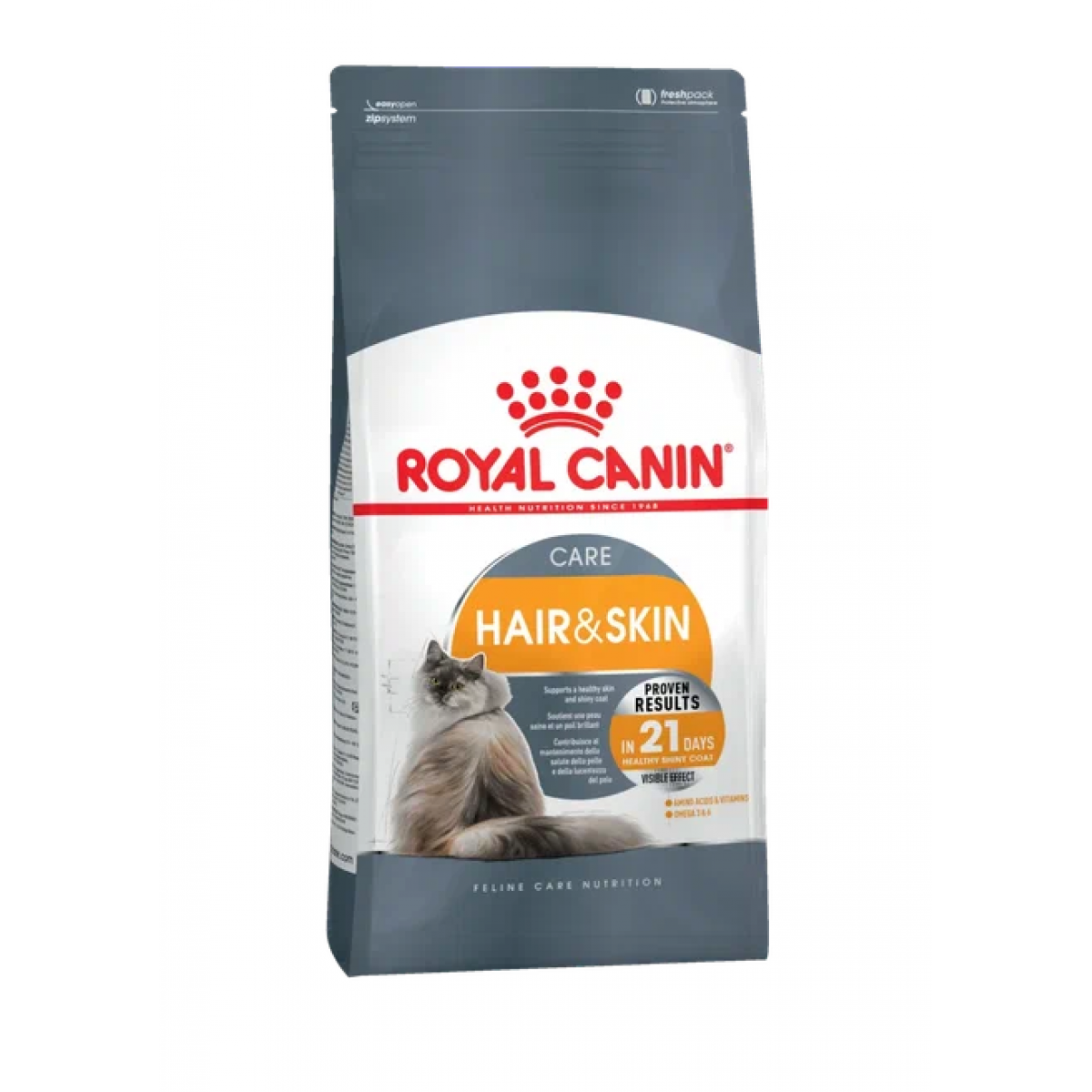 ROYAL CANIN® Hair & Skin Care содержит ряд жирных кислот омега-3 и омега-6, оказывающих благоприятное воздействие на здоровье кожи и состояние шерсти. В качестве источника этих жирных кислот используется соевое масло, масло огуречника аптечного (известным высоким содержанием гамма-линоленовой кислоты) и рыбий жир.
