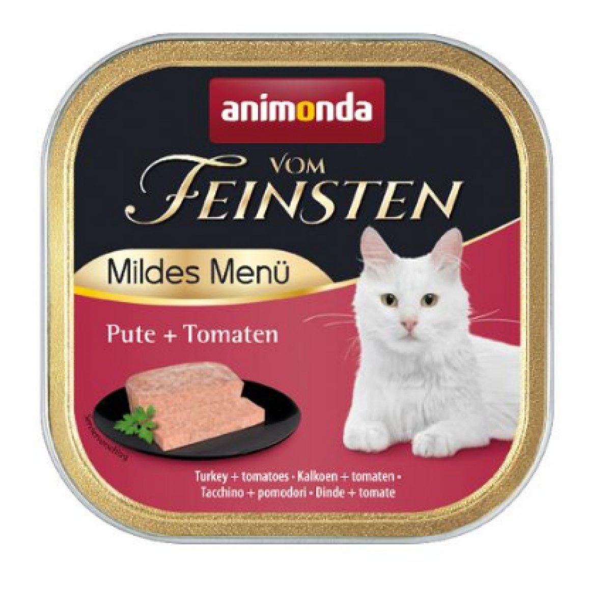 Vom Feinsten Mildes Menu (Индейка с томатами)- это сбалансированное, вкусное, здоровое питание для взрослых кошек от 1 до 6 лет. Вкусные рецепты, приготовленные исключительно из легкоусвояемого мяса индейки - без субпродуктов и печени - предлагают кошкам особое лакомство. Малокалорийные паштеты снабжают взрослую кошку всеми необходимыми питательными веществами.