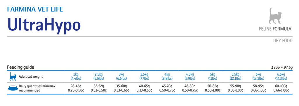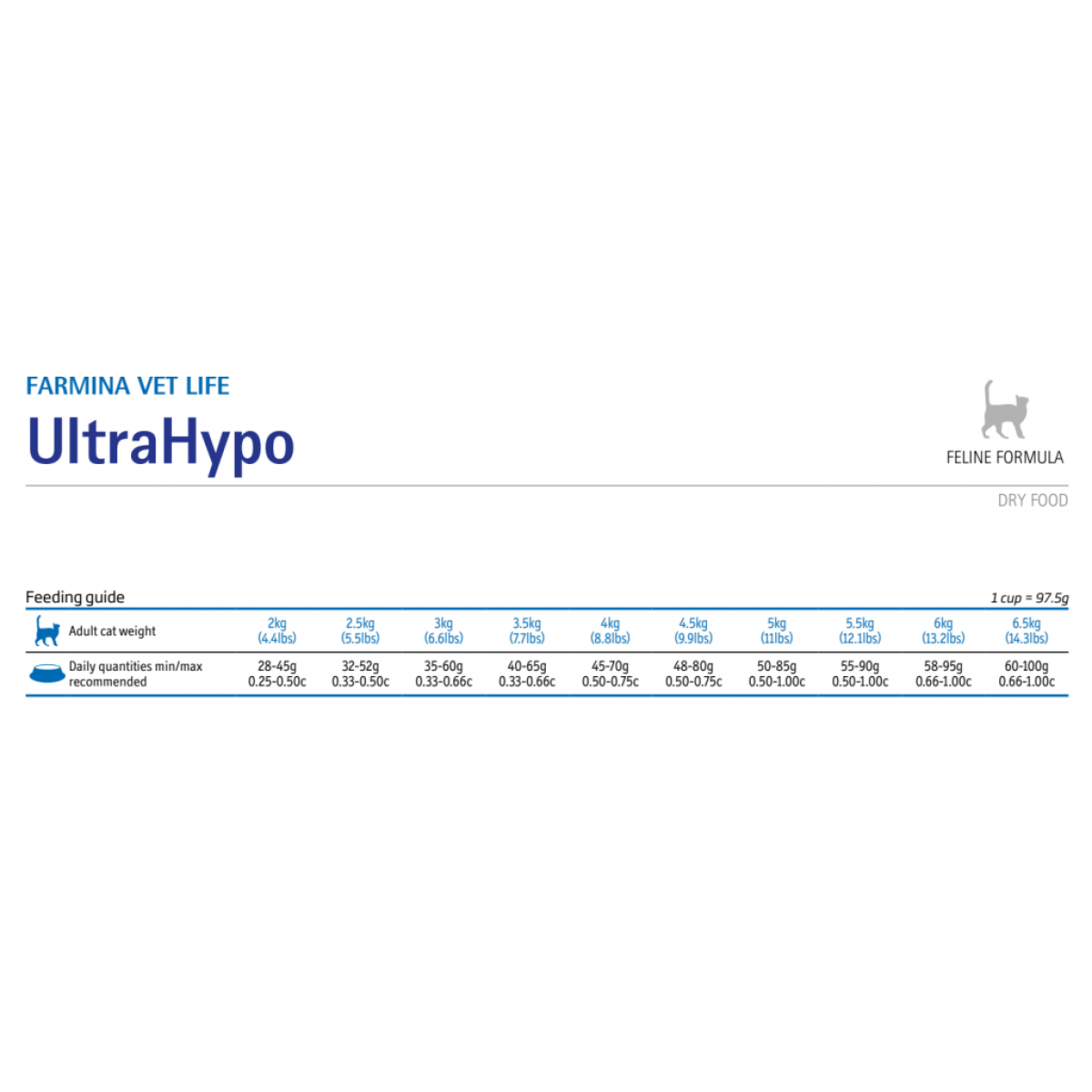 РЕКОМЕНДАЦИИ ПО КОРМЛЕНИЮ:Использовать по назначению ветеринарного врача. Рекомендованные курсы лечения: при пищевой аллергии не менее 4 недель. В случае, если симптомы возникают повторно Farmina Vet Life UltraHypo может использоваться как постоянное питание на протяжении всей жизни. Рекомендуемая дневная норма кормления указана в таблице и имеет ориентировочный характер, необходимо точно установить вес кошки. Дневная норма может быть разделена на 2 и более кормлений. Кошка всегда должна иметь свободный доступ к свежей питьевой воде.
