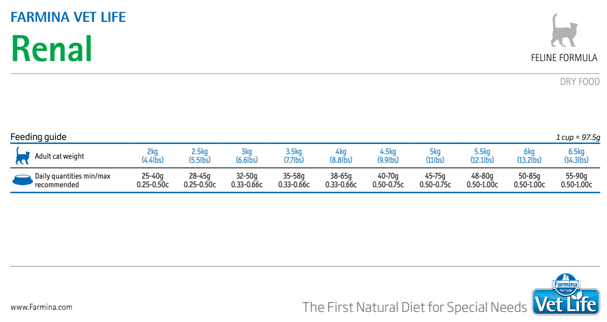 Использовать по назначению ветеринарного врача. Рекомендованные курсы лечения: 6 месяцев (2-4 недели в случаях временной почечной недостаточности). Рекомендуемая дневная норма кормления указана в таблице и имеет ориентировочный характер, необходимо точно установить вес кошки. Дневная норма может быть разделена на два и более кормлений. Кошка должна иметь свободный доступ к свежей питьевой воде.