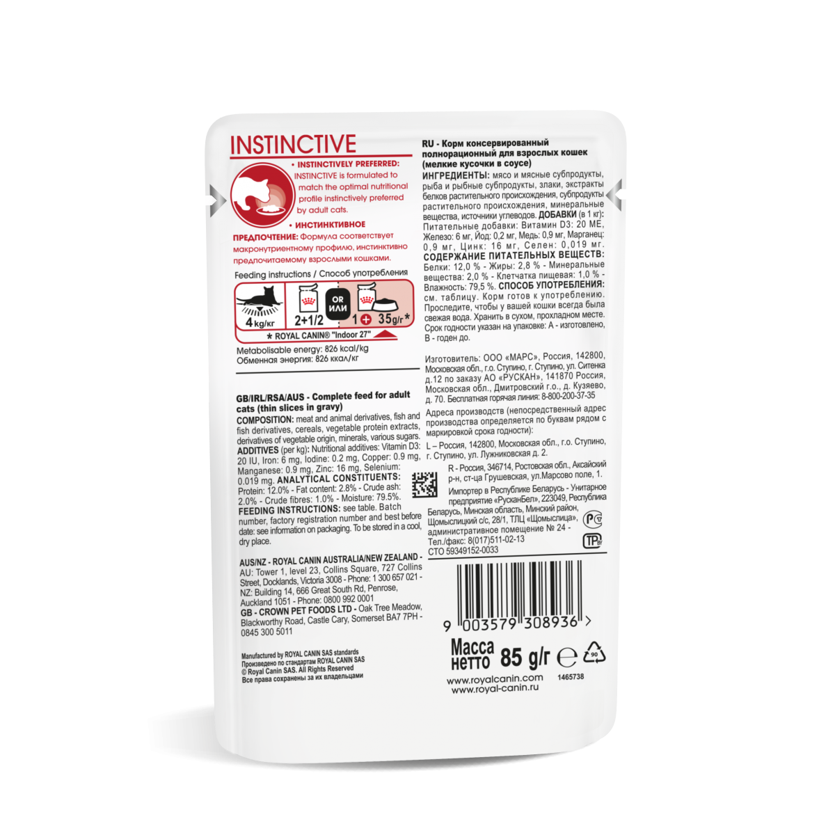 ROYAL CANIN® Instinctive в желе содержит оптимальное количество калорий и обеспечивает длительное чувство насыщения благодаря сбалансированному соотношению белков и клетчатки.