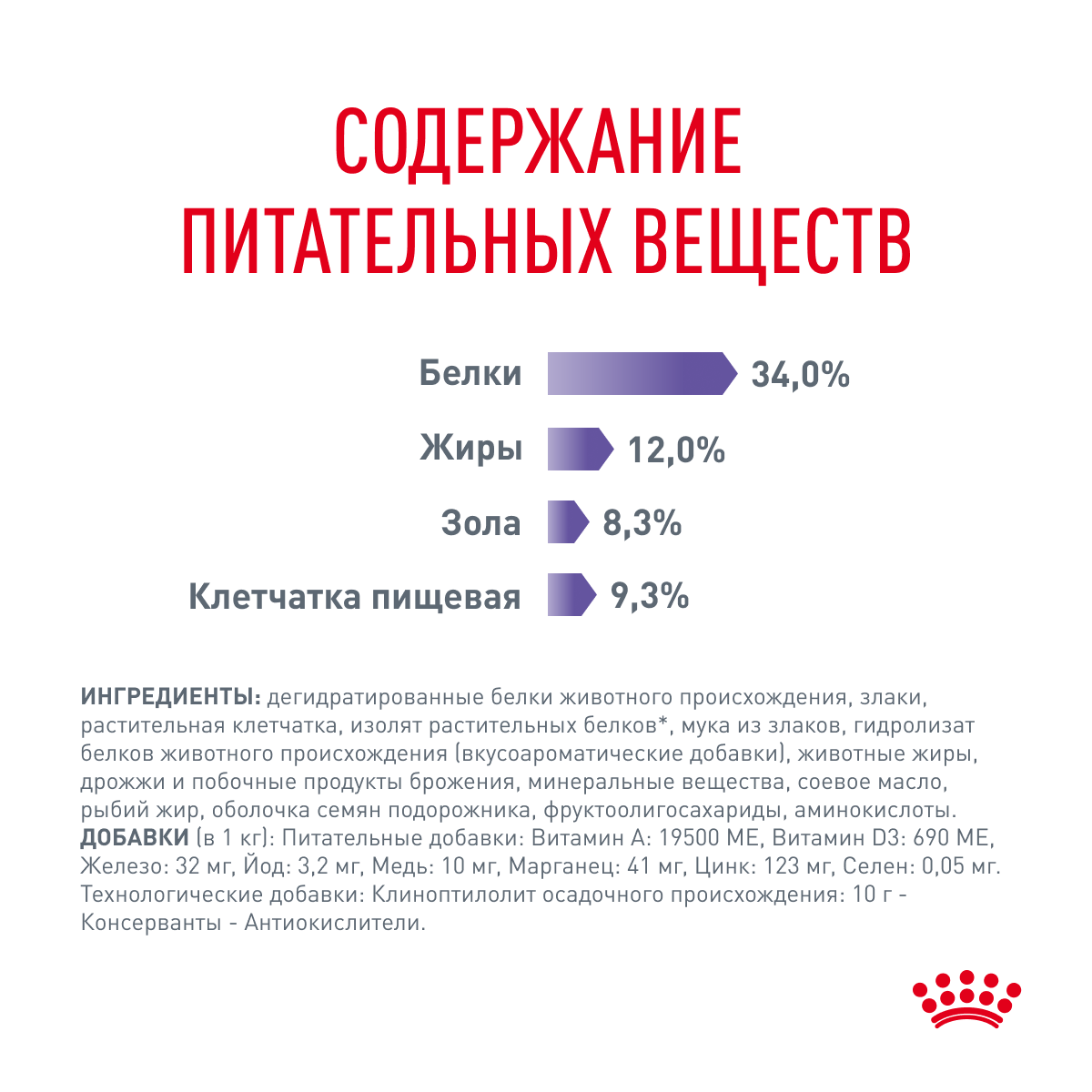 СОДЕРЖАНИЕ ПИТАТЕЛЬНЫХ ВЕЩЕСТВ: Белки: 34,0 % - Жиры: 12,0 % - Минеральные вещества: 8,1 % - Клетчатка пищевая: 9,2 % - L-карнитин: 200,0 мг/кг.