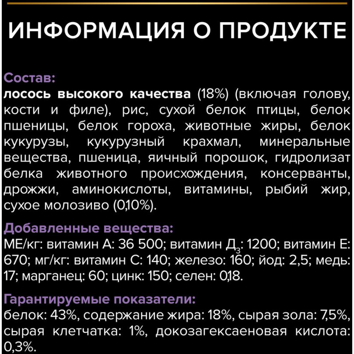 Лосось (18%), сухой белок птицы, рис, пшеничный глютен, пшеница, кукурузный глютен, животный жир, белок гороха, минеральные вещества, кукурузный крахмал, яичный порошок, гидролизат белков животного происхождения, дрожжи, консерванты, витамины, рыбий жир, сухое молозиво (0.1%), аминокислоты, антиоксиданты.
