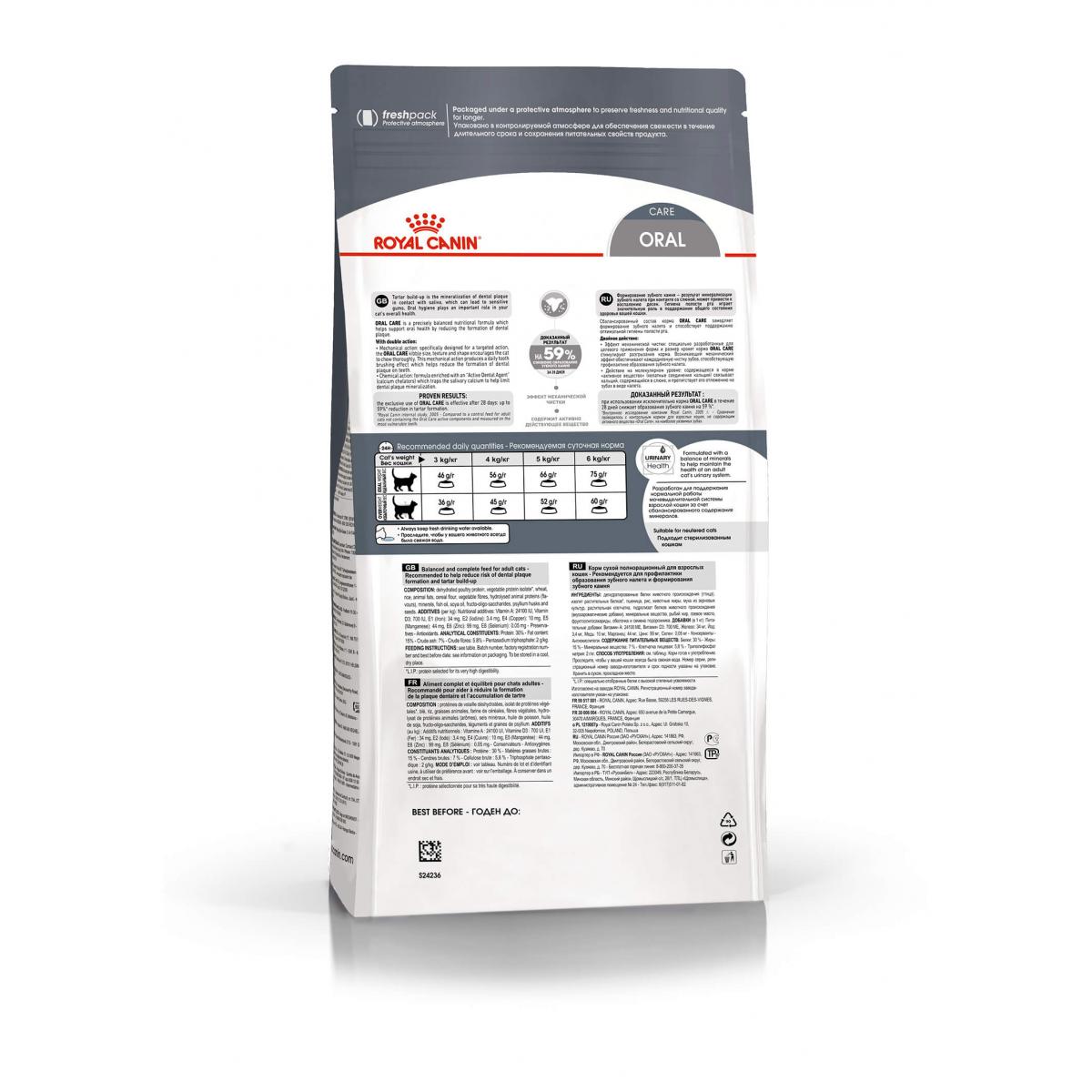 ROYAL CANIN® Oral Care оказывает как механическое, так и химическое очищающее действие на зубы. Размеры, форма и текстура крокет способствуют тщательному разгрызанию корма кошкой, обеспечивая ежедневную очистку зубов от налета.