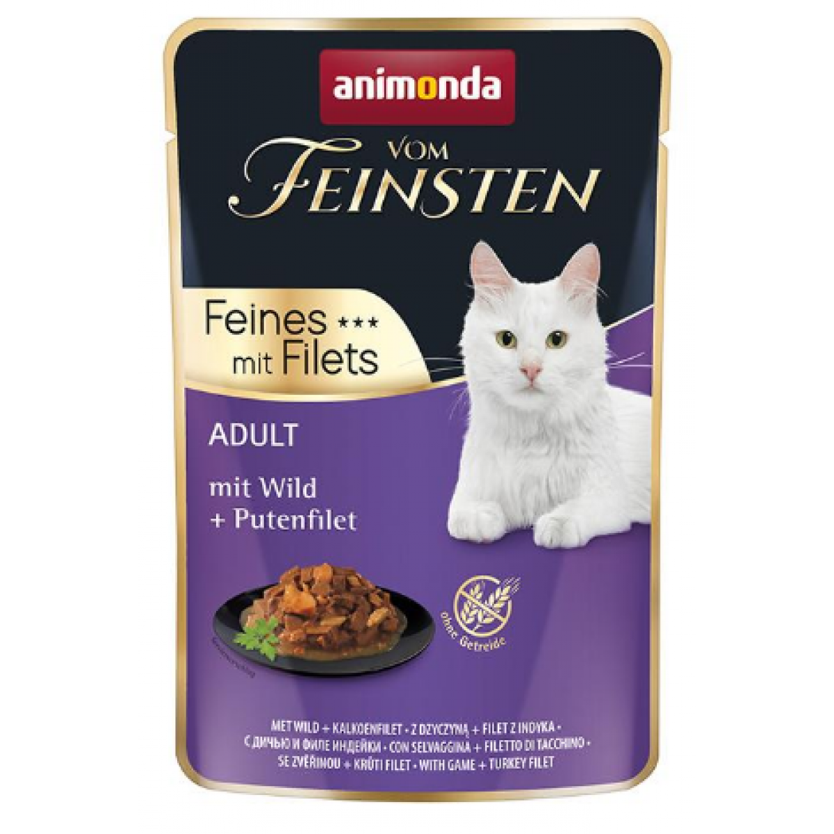 Vom Feinsten Adult Filet (с дичью и филе индейки)- это сбалансированное, вкусное, здоровое питание на высшем уровне для взрослых кошек от 1 до 6 лет. Качество мясных ингредиентов в нежных кусках в сочетании с нежным соусом и тончайшими кусочками филе гарантирует неповторимое удовольствие. Прекрасные рагу для гурманов обеспечивают взрослых кошек всеми необходимыми питательными веществами.