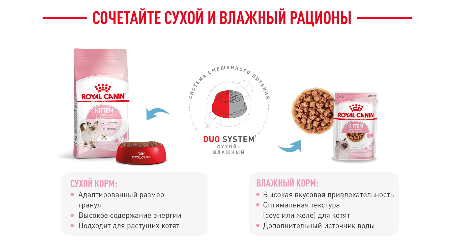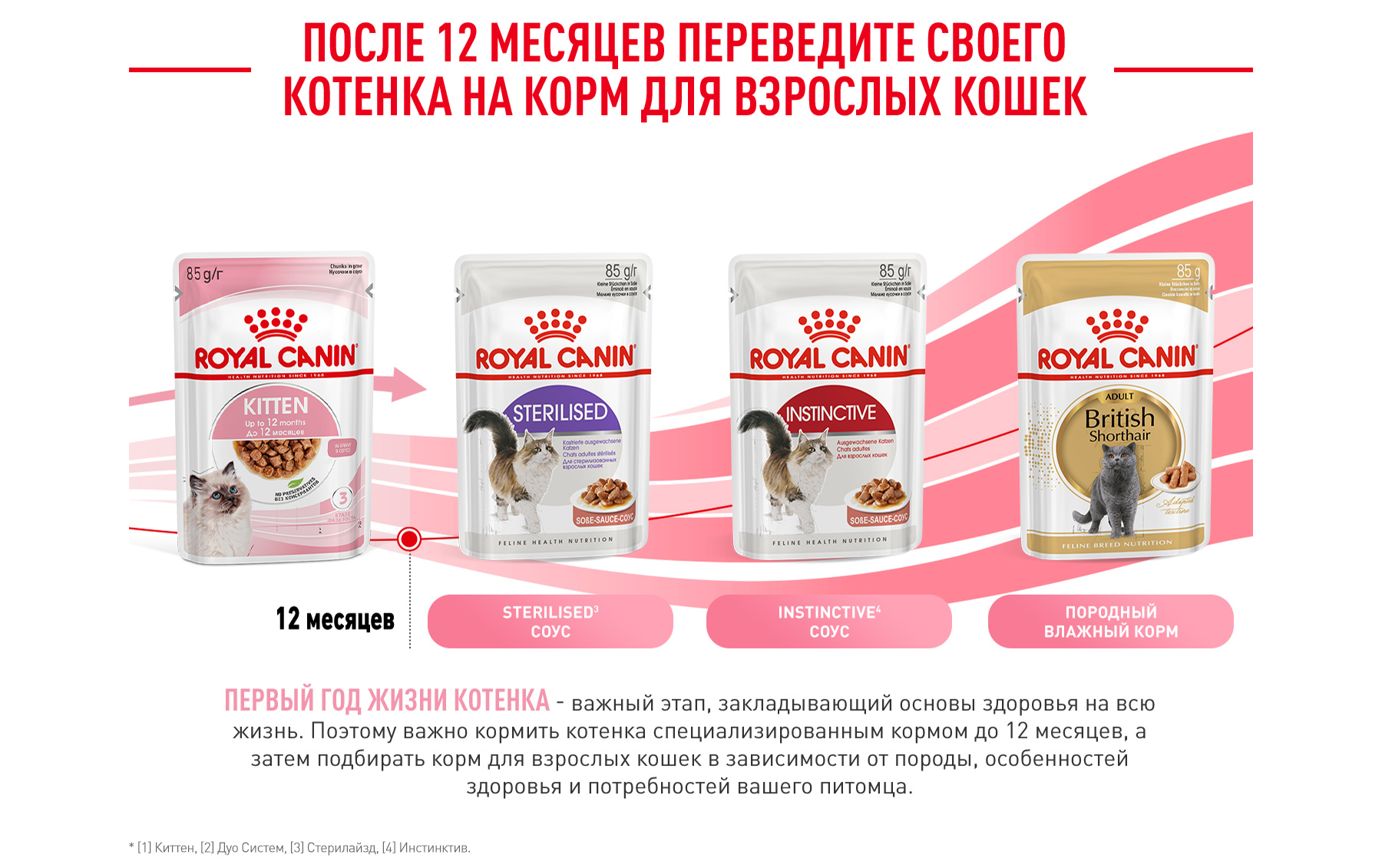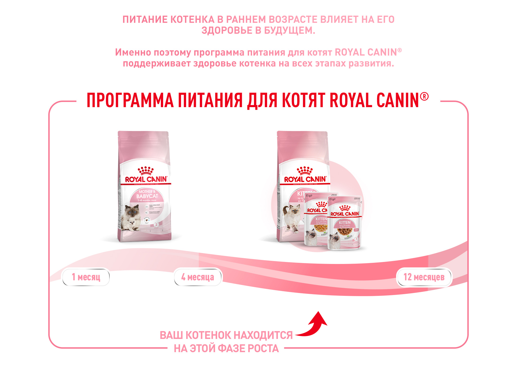 Киттен: влажный корм для котят в возрасте до 12 месяцев. В возрасте от 4 до 12 месяцев скелет котенка продолжает активно расти. Его потребности в энергии еще довольно высоки, но уже начинают постепенно снижаться. Продукт KITTEN в виде мелких кусочков в соусе для котят от 4 до 12 месяцев также оптимально подходит для кошек в период беременности.