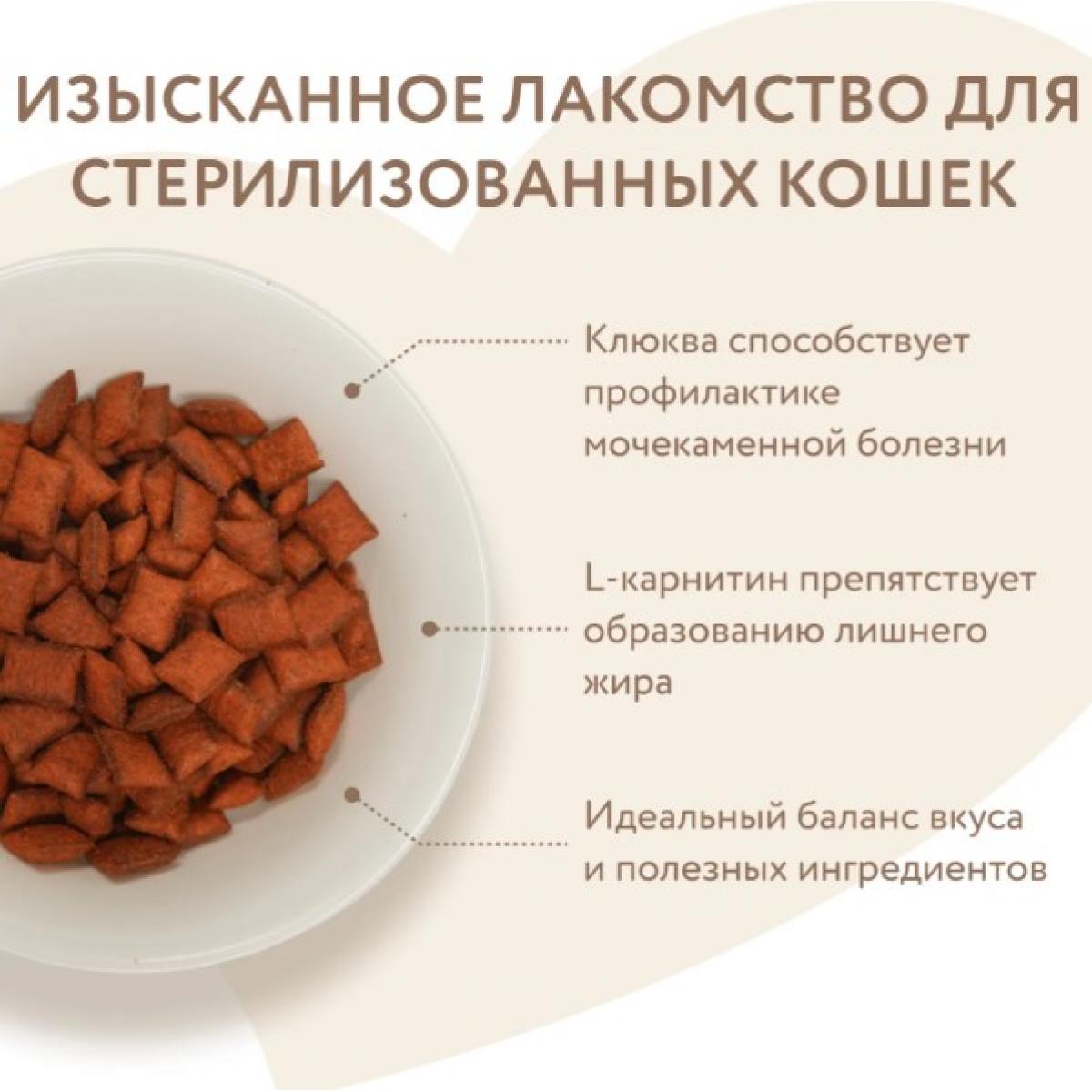 Хрустящие подушечки с цыпленком и клюквой для стерилизованных кошек - это возможность проявить свою любовь и позаботиться о здоровье вашей кошки. Клюква способствует профилактике мочекаменной болезни, а L-карнитин препятствует образованию лишнего жира у кошек, склонных к полноте.